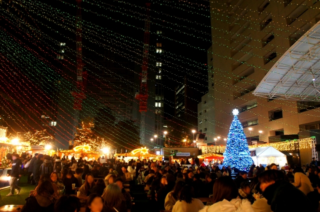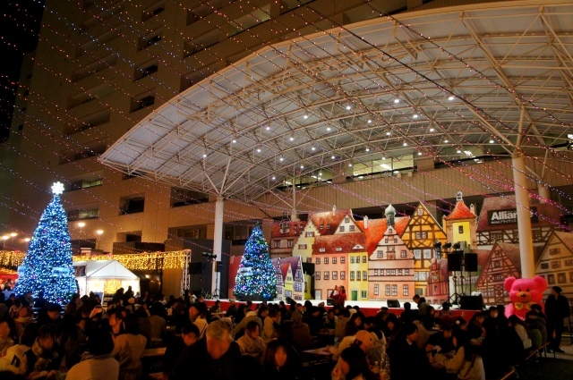 ヨーロッパの伝統的なクリスマスマーケットを再現していて、木製のヒュッテ(小屋)にライトが灯り、広場全体がイルミネーションに包まれます。
