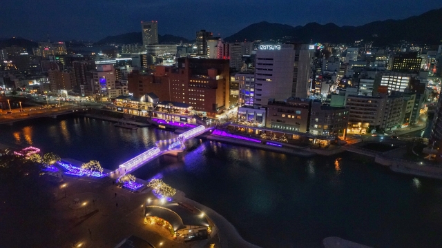 最後に紹介するのが北九州市小倉北区で行われているイルミネーション。大型商業施設のリバーウォークや小倉城付近から川を渡る橋にかけて鮮やかな色の装飾がされていて冬の代表的イベントと言えるでしょう。イベントも開催されていたりと人の賑わいもかなり凄いです。小倉駅から夜の街並みを楽しみながら小倉城方面へ向かうのも楽しいと思います。是非、北九州市最大の街である小倉のイルミネーションを楽しまれてください。